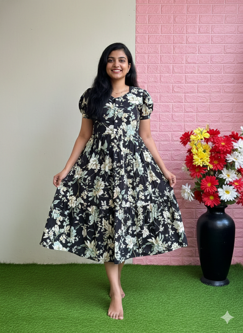 Elegant Black & Sage Floral Printed Tiered Midi Dress with Puff Sleeves